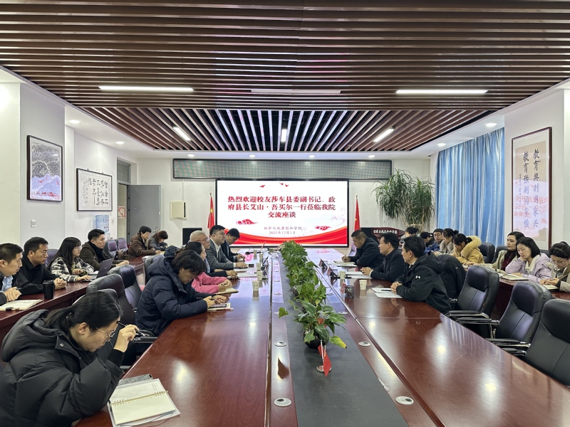 2025121日下午,莎车县人民政府与新疆农业大学林学与风景园林学院交流座谈会在学院会议室举行。双方围绕特色林果业提质增效、生态保护与建设等议题展开深入交流,共同绘制校地合作新蓝图,旨在推动区域经济高质量发展,助力乡村振兴。莎车县委副书记、县长艾山·吾买尔,莎车县委副书记吴显中,莎车县林草局党组书记张涛,新疆农业大学科技处副处长马合木江·艾合买提新疆农业大学林学与风景园林学院全体在家班子成员及相关专业老师30余人参加会议。座谈会由林学与风景园林学院院长阿地力·沙塔尔主持。